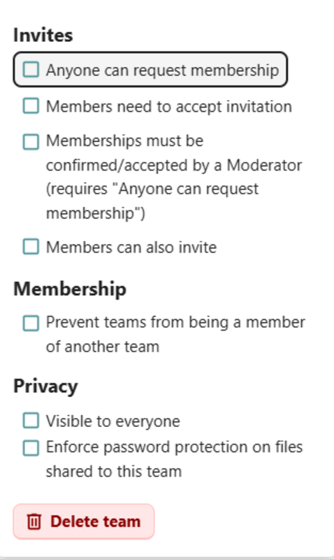 - Visibility Control: Teams can be public (anyone can join), restricted (request to join), or private (invite-only).
