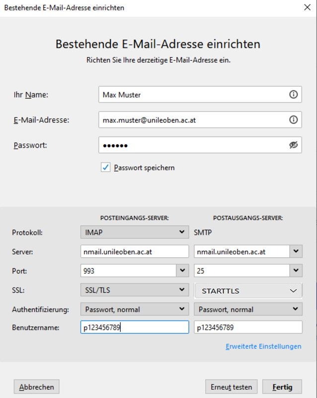 | Posteingangsserver (IMAP): | 993 (SSL/TLS) verwenden |
